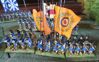 My latest attempt at a Dutch Horse Regiment of the 1670s - Montpouillon's. The uniform seems to have been grey coat with red facings, but I have done them with their buff coats on as well. The standard of the unit is homemade, based on an image in B. Mygnai's book on the Army of the United Provinces. Although the latter dates from 1690, Montpouillon was the colonel of the unit from 1672, so I have used "wargamer's licence" and assumed the regiment had the same standard from that date.