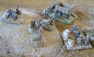 The table was 6 feet by 4 feet, with about 100 figures per side, the Allies having six tanks and three armoured cars, the Axis nine tanks, one self-propelled AT gun and twelve lorries, with two kubelwagens for the artillery OPs. Offboard artillery for the Axis was a battery of 105mm howitzers; for the Allies a mortar platoon and a half-battery of 25pdrs.