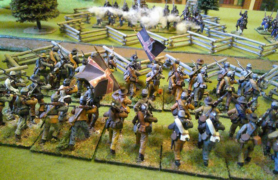 Anyway, I found it another fast and fun game, although I played it slightly differently from the first game. The opposing sides were the same, but I rolled a die to randomly place each sides regiments (in groups of two) along their table edge. The result was plenty of action in the woods, from which the Confederates emerged victorious, a bit of a see-saw fight in the centre, and the Confederates making an effective flank move around the farm. I called the game after nine turns in favour of the Rebels.